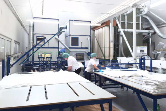 第二天早上9点,我们开始了对工厂的参观。企业负责人之一的Klöfer先给我介绍了企业的管理团队,至今为止,OBB董事长ErichSchweigert那句对自身品牌的评价依旧印象深刻—“高端床品造就睡眠和优雅之极的传统。”