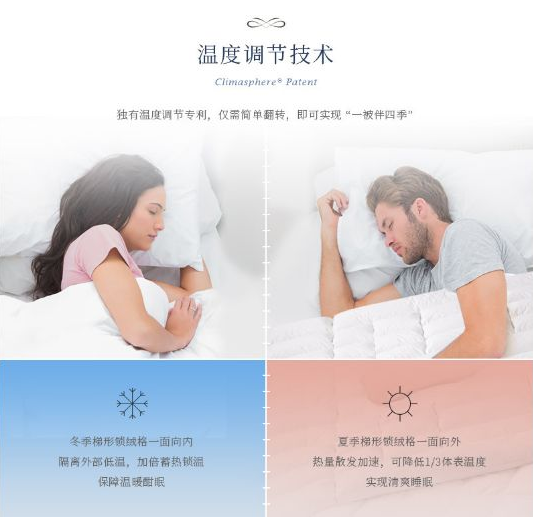 Climasphere冬夏两用被,有特殊温度调节设计,达到冬夏两用的目的。完美解决了夏季空调房里,盖被嫌热,不盖被易感冒的矛盾。